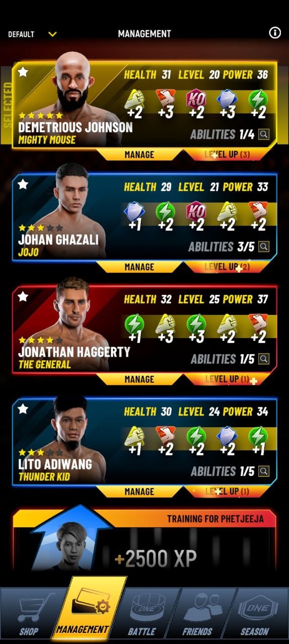 ONE Fight Arena is a strategic mash-up of match-3 puzzles and fast-paced player-versus-player (PvP) fighting. Players can select from a wide variety of ONE athletes, such as MMA legend and former ONE Flyweight MMA World Champion Demetrious “Mighty Mouse” Johnson, former longtime ONE Flyweight Muay Thai World Champion Rodtang “The Iron Man” Jitmuangnon, reigning ONE Women's Atomweight MMA World Champion Stamp Fairtex, and current ONE Bantamweight Kickboxing World Champion Jonathan “The General” Haggerty, among many others. With an immersive first-person perspective, players of ONE Fight Arena can experience the unique world of martial arts and guide their chosen athletes from the start of their careers to World Title glory.